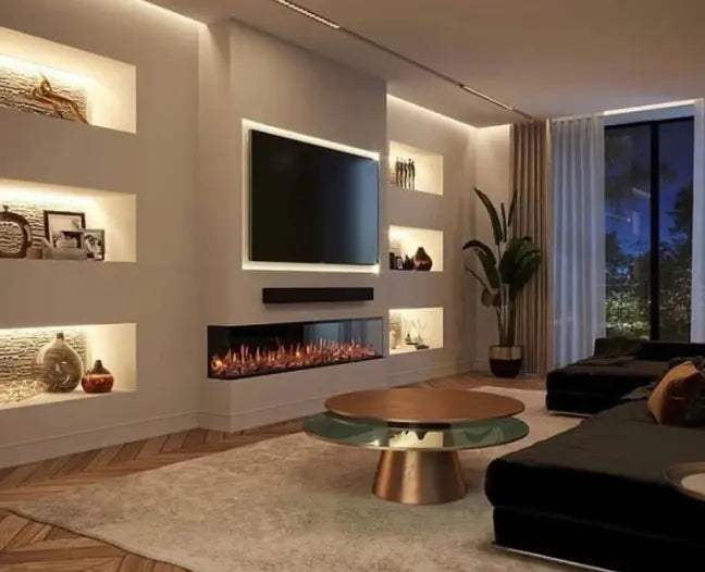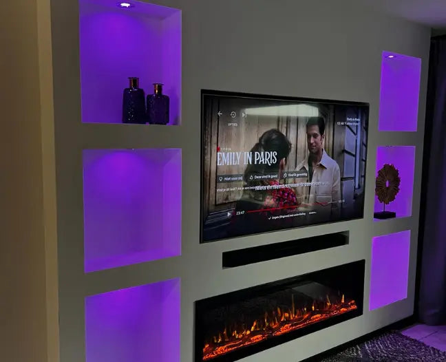 Bepaal allereerst of de tv-muur een deel van de muur of de gehele muur in beslag gaat nemen. Daarnaast is het belangrijk dat je tv en elektrische haard precies in de wand passen.