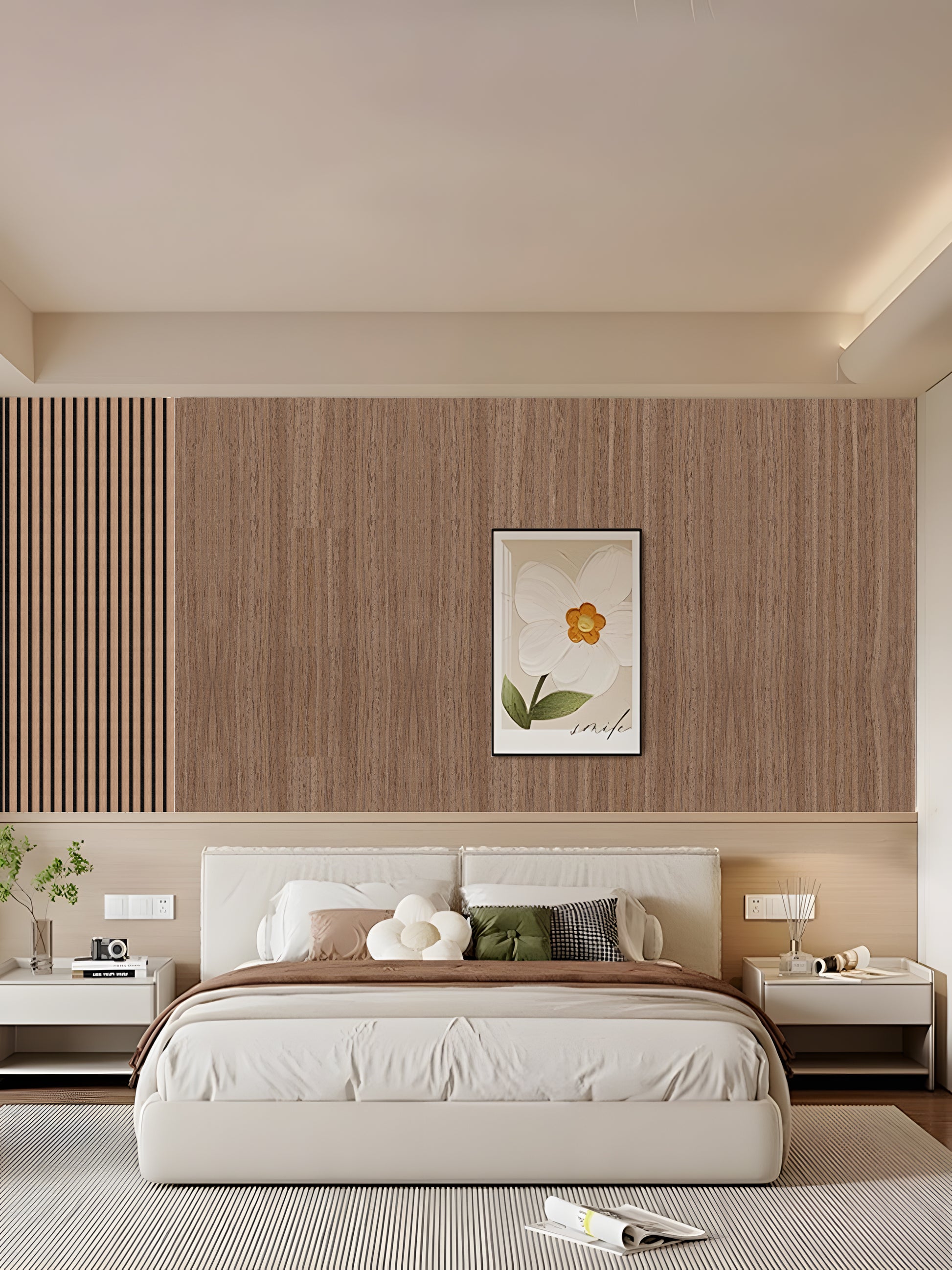Het walnoot eiken brengt een gevoel van verfijning en warmte in elke ruimte. De natuurlijke houtnerf zorgt voor een stijlvolle, tijdloze uitstraling die past bij uiteenlopende interieurstijlen. Combineer de panelen met onze Akupanel collectie voor een luxe, samenhangend geheel aan de muur.